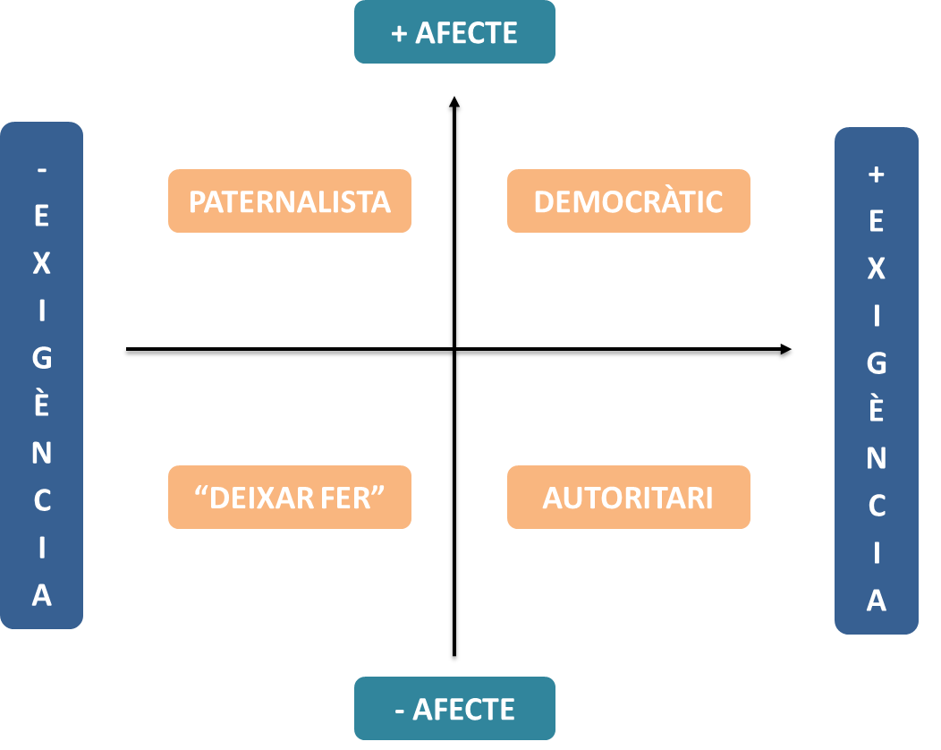 La següent figura representa els quatre estils educatius segons el grau d'afecte i exigència que implica cadascun d'ells: