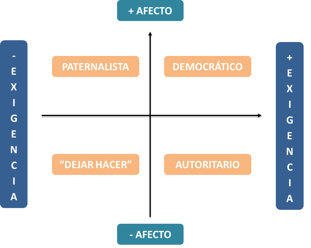 La siguiente figura representa los cuatro estilos educativos según el grado de afecto y exigencia que implica cada uno de ellos: